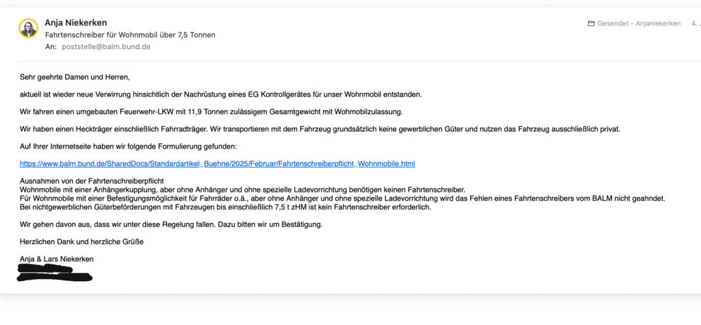 Sämtliche Anfragen an Behörden, Ämter, Ministerien usw. gehen ins Leere. Dort sind immer Leute, die in Denkmustern gefangen sind, die das Ergebnis der Bubble in der sie leben. Auch die immer wieder zitierten beiden angeblichen einschlägigen Urteile sind in den wenigsten Fällen auf den Wohnmobilisten, der ein Auto hinterher zieht oder im Hintern/Bauch seines WOMO mitführt, anwendbar. Insbesondere in dem Fall mit den Pferden. Das Fahrzeug gehörte einer GmbH und Co KG und die Halterin/verantwortliche Unternehmerin konnte weder die überwiegende private noch eine private Einzefallnutzung des Kfz glaubhaft darstellen. Ausgangspunkt in diesem Fall war auch nicht ein nicht vorhandenes Kontrollgerät, sondern die Weigerung der Unternehmerin die ausgelesenen Daten des angeforderten Zeitraums zu Kontrollzwecken an die auffordernde Behörde weiter zu geben. Die angekündigte koordinierte Stellungnahme wird für uns mit Sicherheit kein befriedigendes Ergebnis bringen. Man kann nur hoffen, dass einer der bereits anhängigen Fälle höchstinstanzlich, vertreten durch einen „creativen“ Anwalt, jenseits der EG 561/2006… entschieden wird
